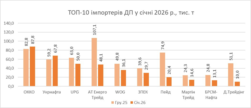 Зниження кількості трейдерів підсилило позиції десятки найбільших імпортерів, яка становила 83% (378 тис. т) проти 74% у грудні. Проблеми з погодою і якістю дизпального вдарили по показниках більшості лідерів, винятків було два – ОККО й «Укрнафта».