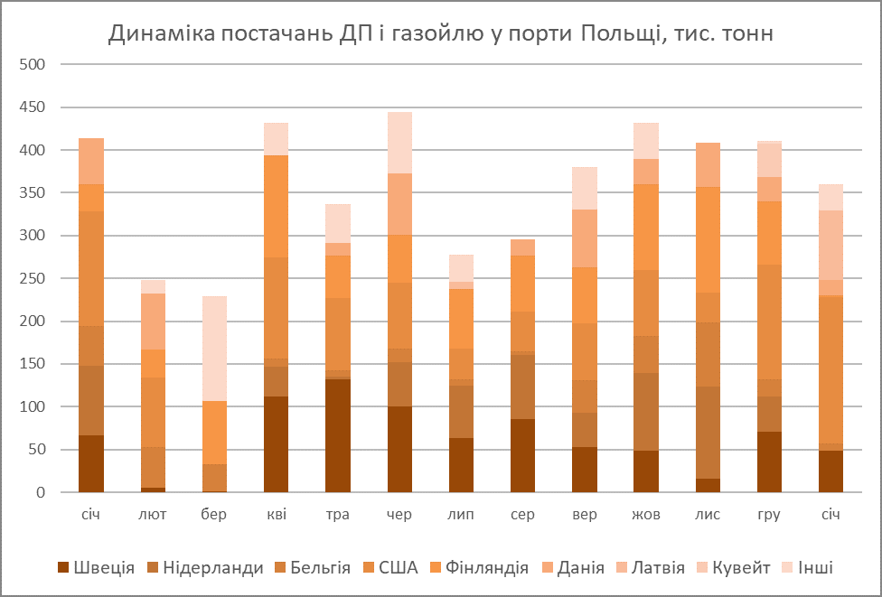 У січні в Польщу не постачалося паливо з Фінляндії, тоді як у грудні звідти надійшло 73 тис. т. Нагадаємо, фінський НПЗ Neste Oil був цієї зими одним з постачальників арктичного дизпального на український ринок.