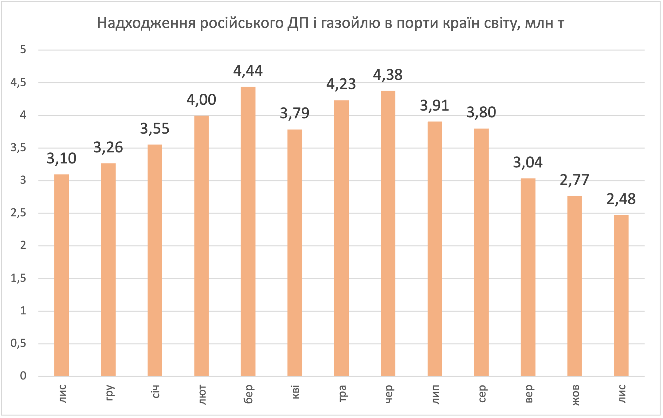 За 11 місяців обсяги надходження російського дизпального й газойлю у порти країн світу зросли на 2%, до 40,4 млн т.