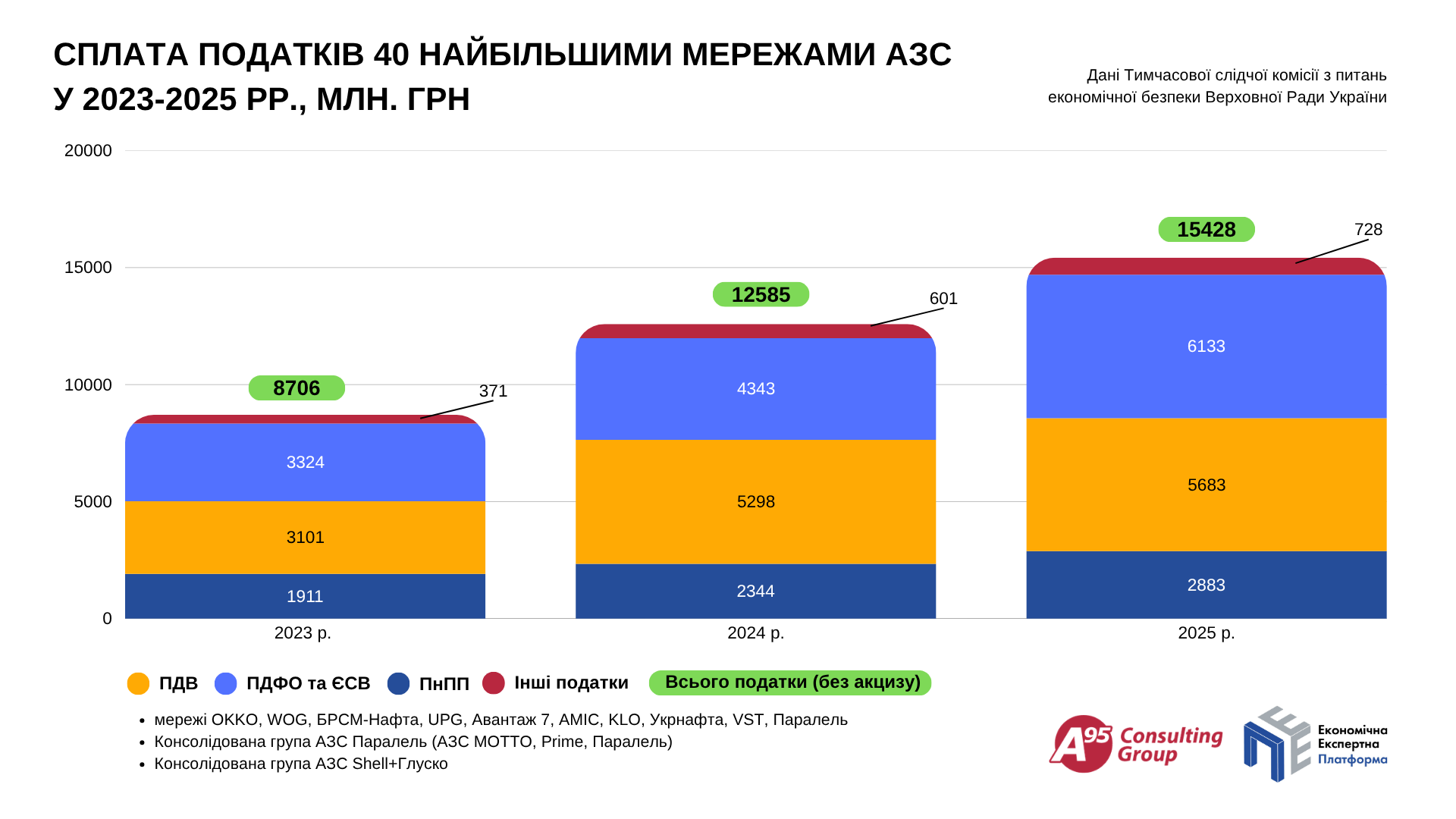 Окремим драйвером збільшення податкових надходжень стало запровадження з грудня 2024 року авансового внеску з податку на прибуток — 60 тис. грн на місяць з кожної АЗС незалежно від фінансового результату. Це рішення було відповіддю держави на хронічну «збитковість» операторів.