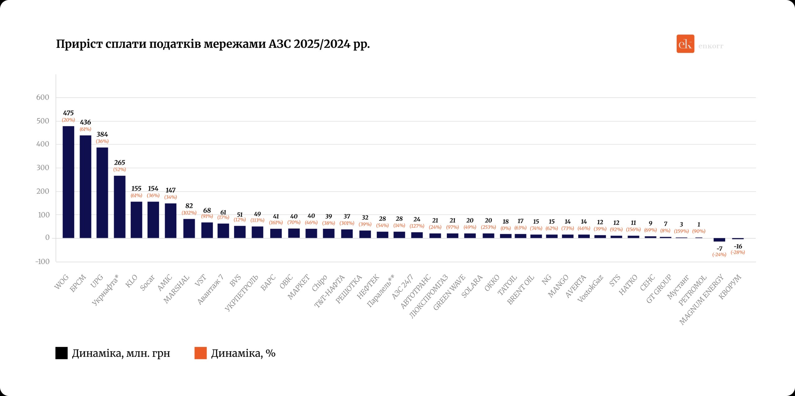 Разом з цим у рейтингу загального приросту податкових платежів лідером стала мережа WOG, яка збільшила відрахування на 20%, або на 475 млн грн — до 2,8 млрд грн. Основний внесок забезпечило дворазове зростання зарплат, які перевищили 30 тис. грн на місяць.