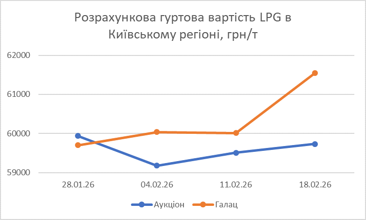 Сезонно низький попит на скраплений газ, попри зниження надходжень ресурсу, не дає цінам реагувати на зовнішні чинники. Згідно з моніторингом Консалтингової групи «А-95», середня вартість пального на 18 лютого становила 59 410 грн/т, продемонструвавши помірне зростання (230 грн/т).