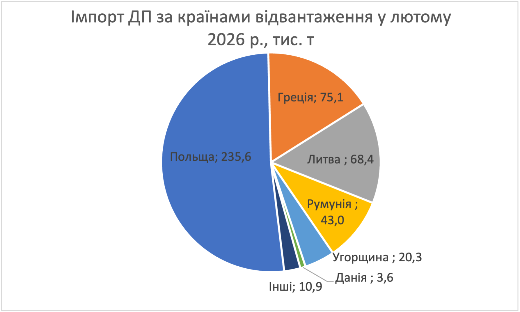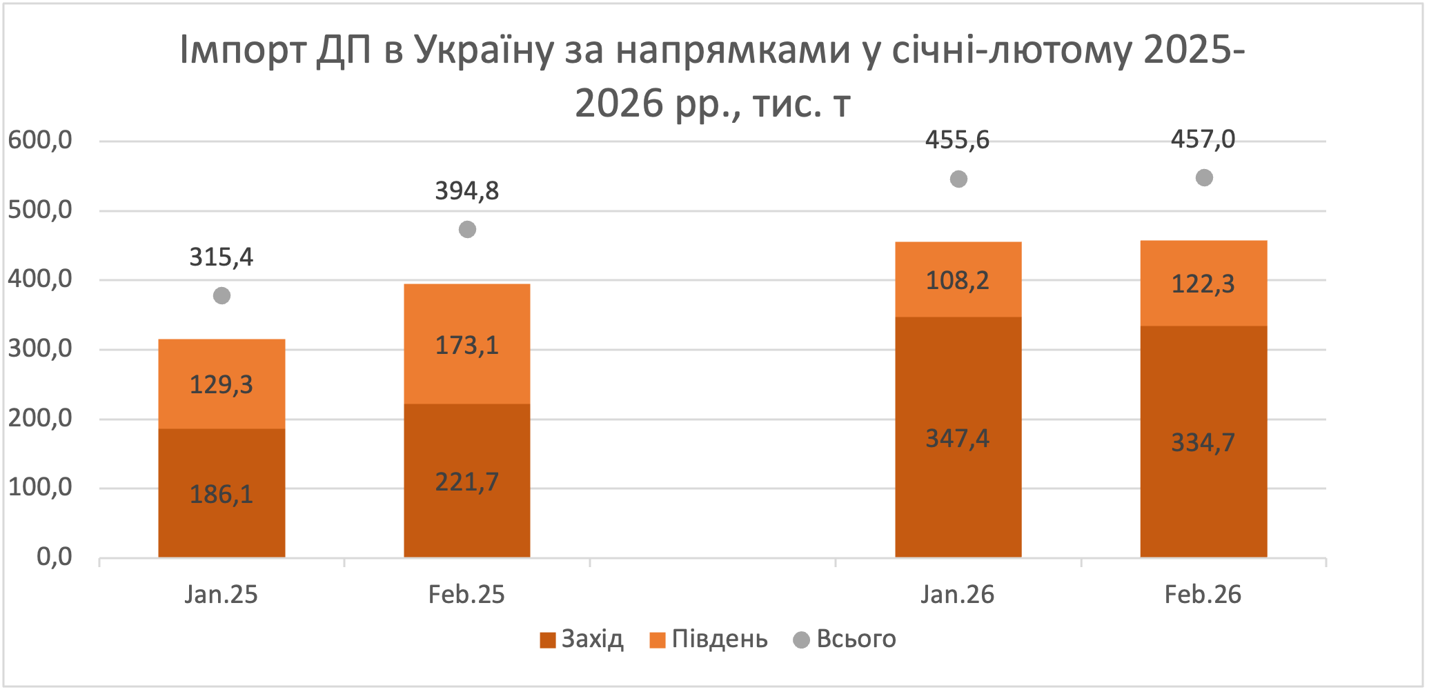 Найбільший постачальник — Польща. Це 52% загального імпорту (235 тис. т) і це 85% більше, ніж у лютому 2025-го. ORLEN як центральний персонаж наростив постачання з Польщі й Литви на 80%!