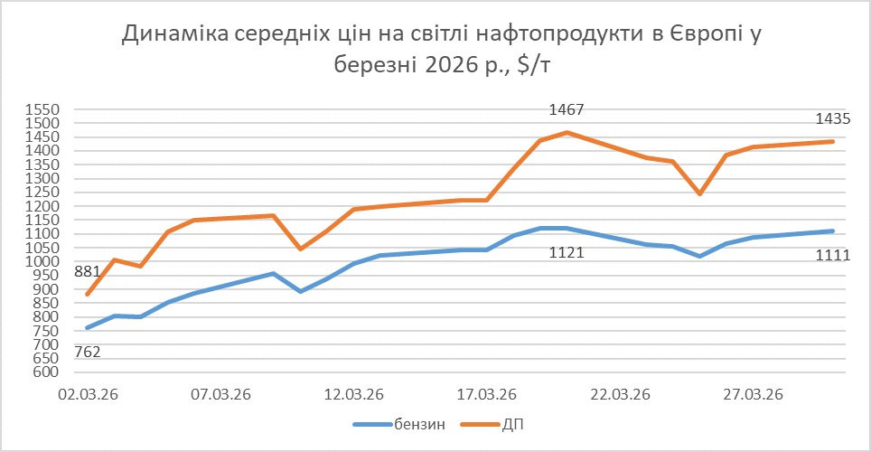 Його дефіцит у Європі підтримував високий попит і провокував стрімке зростання цін. Так, з початку березня європейські котирування бензину в середньому зросли на $349/т (13,66 грн/л), на дизель — на $553,4/т (24,28 грн/л).