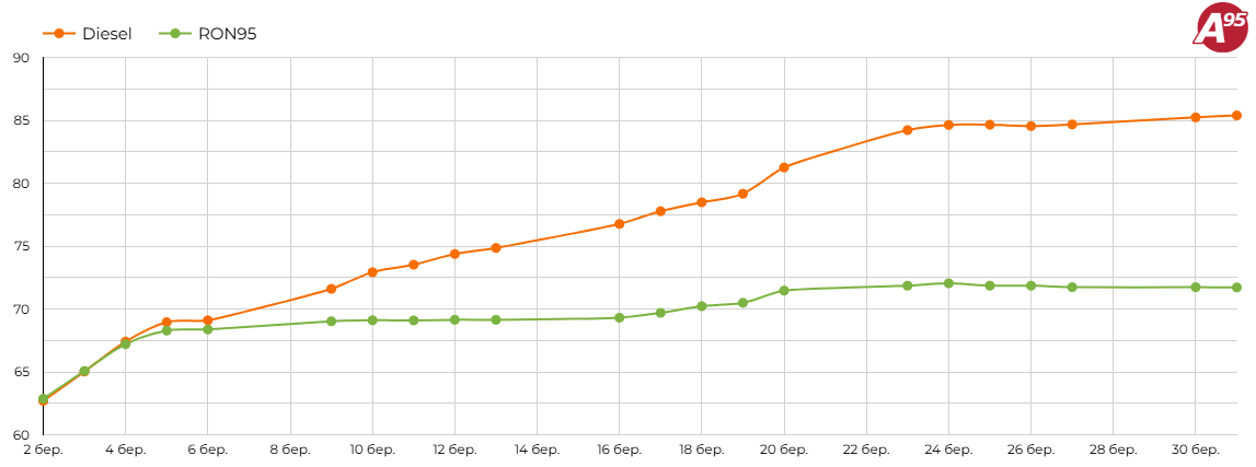 У той же час, згідно з моніторингом Консалтингової групи «А-95», гуртова вартість бензину марки А-95 збільшилася майже синхронно із зовнішнім ринком — на 13,82 грн/л (до 68,59 грн/л), тоді як дизель продемонстрував стрімкішу динаміку, здорожчавши на 26,12 грн/л — до 87,35 грн/л.