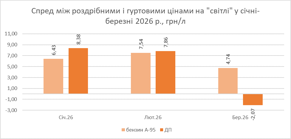 За підсумками місяця середній спред між гуртом і роздробом на дизелі становив -2,07 грн/л, в той час, як ще у лютому це було 7,86 грн/л, і багатьох не дуже влаштовувало. На бензині різниця хоч і залишалася у позитивній площині, але опустилася до мінімуму з серпня 2023 року — 4,74 грн/л (мінус 2,80 грн/л до попереднього місяця).