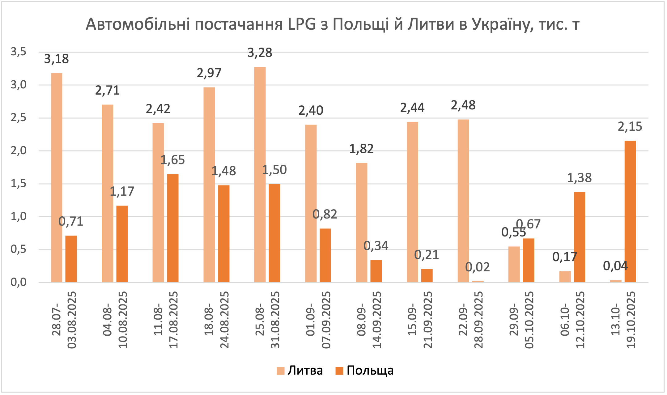 Постачання з польських терміналів зростають третій тиждень поспіль через проведення ремонтних робіт на Мажейкяйському НПЗ ORLEN Lietuva. Своєю чергою постачання скрапленого газу з Литви минулого тижня впали до 38 тонн (2 машини), що є найменшим обсягом з квітня 2021 року. Учасники ринку вважають, що потік з литовських базисів почне відновлюватися ближче до кінця жовтня.