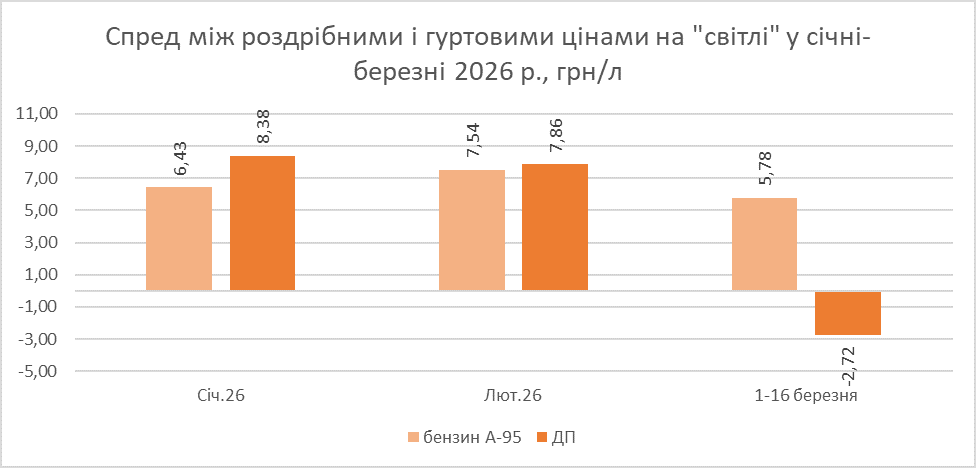 Різноспрямова динаміка опту і розробу не дала спреду на дизель вийти в позитивну площину. Станом на 16 березня, різниця між сегментами на дизелі склала -1,24 грн/л, на бензині — 4,74 грн/л. В середньому з початку місяця спред на бензині становив 5,78 грн/л (-1,76 грн/л до рівня лютого) і -2,72 грн/л (мінус майже 10,60 грн/л).