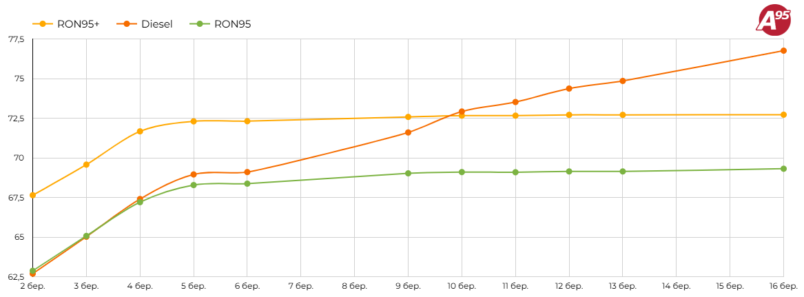 В той же час на стелах АЗК середній цінник на бензин марки А-95 збільшився на 0,33 грн/л (69,31 грн/л), на дизель зріс на — 4,73 грн/л (76,76 грн/л).