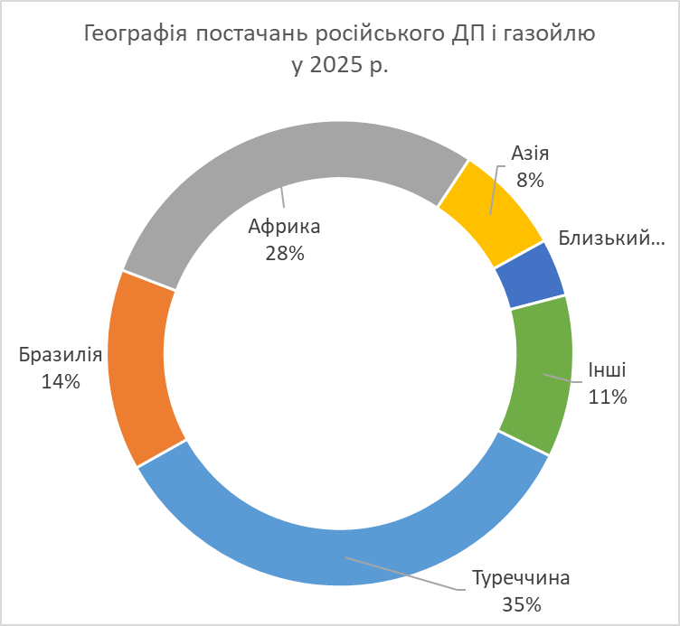 Водночас запровадження санкцій проти російських виробників палива та тіньового флоту сприяло зміни географії постачань дистилятів. Найбільші імпортери російського дизпального та газойлю, Туреччина та Бразилія зменшили обсяги закупівель.