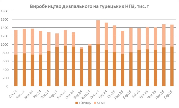 Зростання обсягів випуску в країні відбулося шляхом збільшення виробництва на НПЗ STAR. З січня по серпень цього року завод, що належить SOCAR, виробив 4,42 млн т, це на 15% перевищує показники 2024 року. З травня по жовтень минулого року STAR працював з неповним завантаженням, що було пов’язано з проведенням ремонтних робіт. Варто зазначити, що НПЗ STAR є одним з великих постачальників дизпального на український ринок. За дев’ять місяців компанія відвантажила 282 тис. т, це на 66% більше порівняно з аналогічним періодом торік.