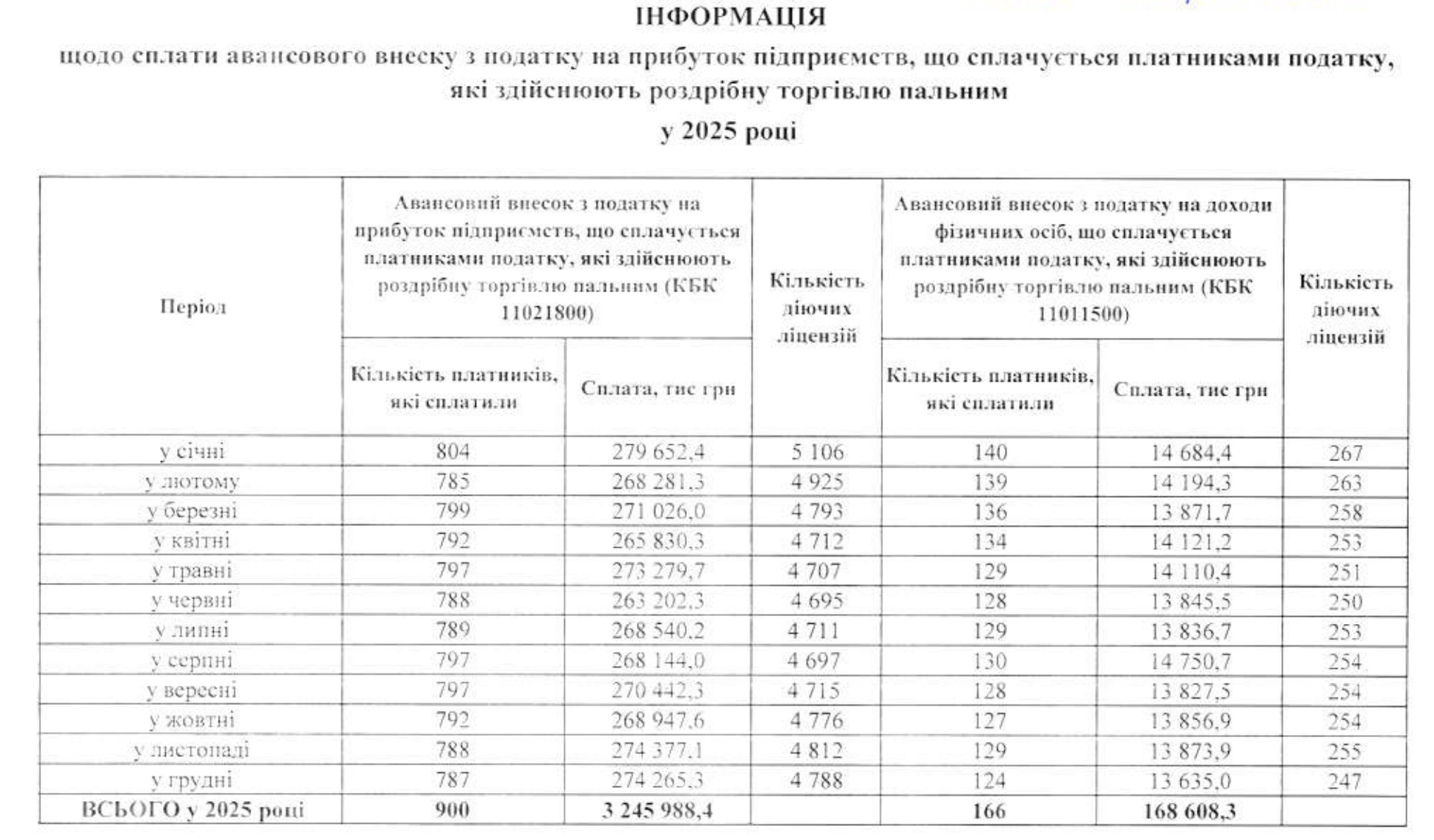 Згідно з ними, 2025 року суб’єкти роздрібної торгівлі пальним перерахували 3,41 млрд грн авансових платежів — з них 3,24 млрд грн з податку на прибуток (КБК 11021800) і 168,6 млн грн — авансового внеску з ПДФО (КБК 11011500).