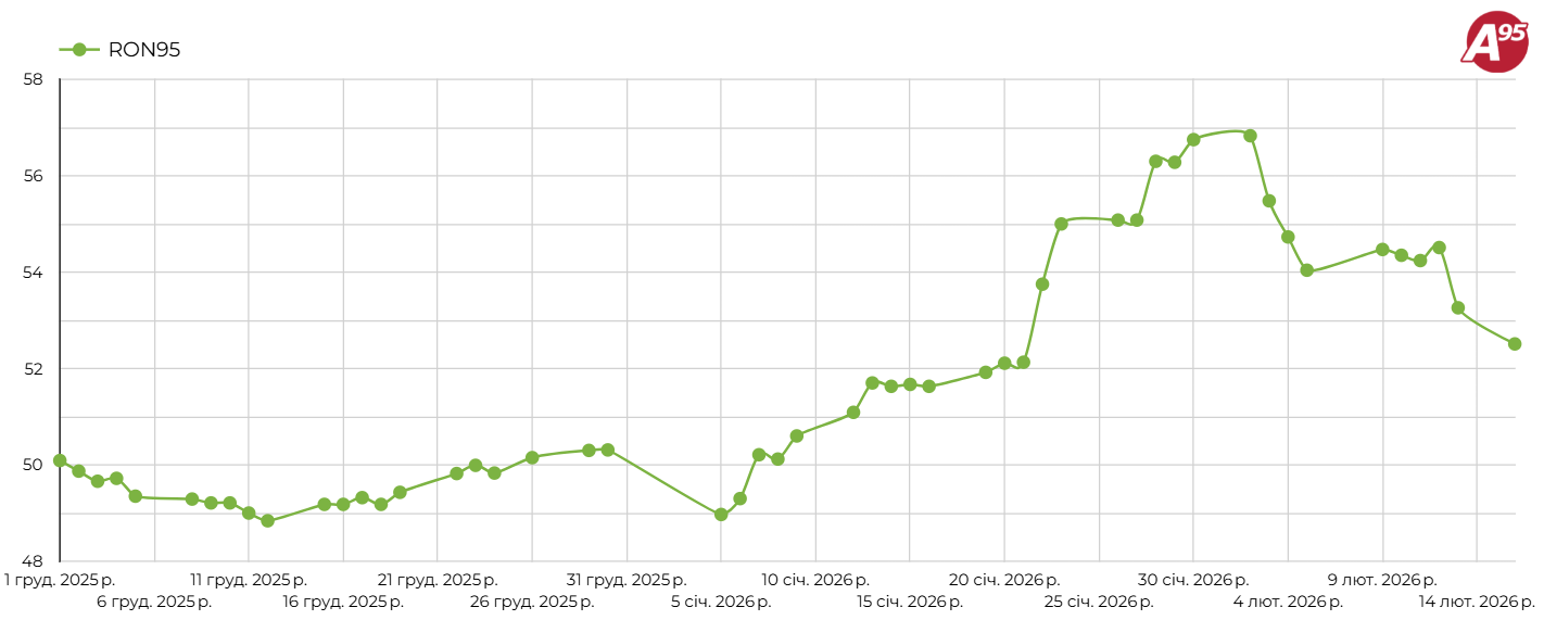 Це, своєю чергою, прибрало ажіотажну складову у формуванні ціни на бензин. Згідно з моніторингом Консалтингової групи «А-95», після пікового зростання на початку лютого середня вартість бензину А-95, станом на 16 лютого, знизилася на 4,32 грн/л, до 52,51 грн/л.