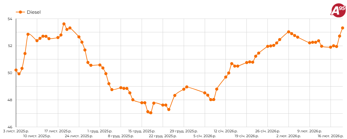 Зростання європейських котирувань на тлі повернення ціни на нафту вище від $70/т призвело до стрибка ціни на дизель на внутрішньому ринку. Протягом останніх двох днів, 18-20 лютого, вартість ресурсу зросла на 1,37 грн/л, до максимальних з листопада 2025 року 53,32 грн/л. Про це свідчать дані моніторингу Консалтингової групи «А-95».