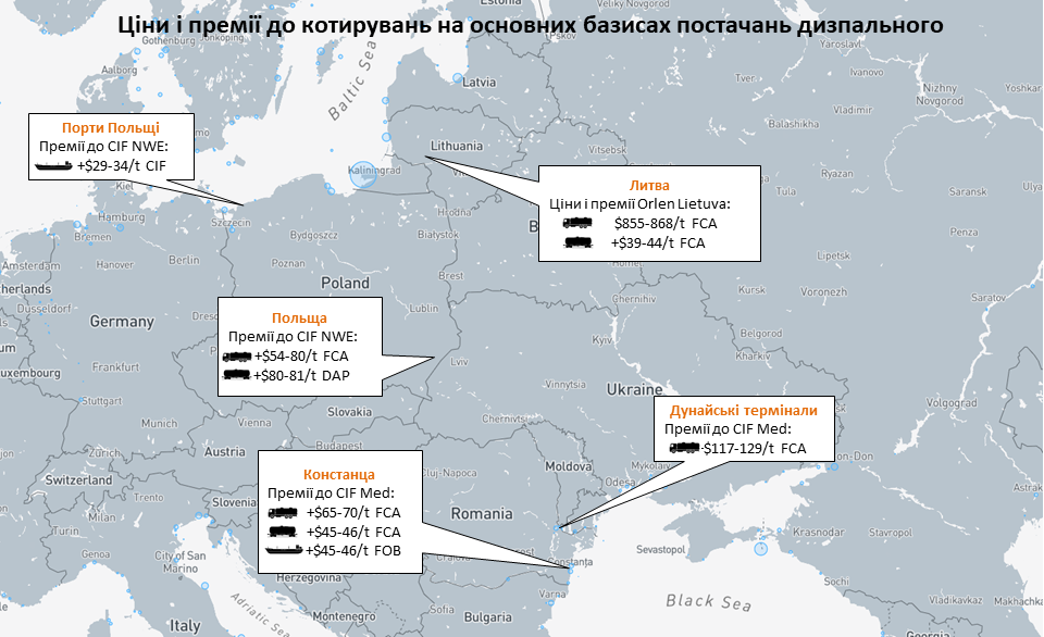 Перемовини з ORLEN тривають, проте відомо, що націнки на вагони з Журавиці, ймовірно, зростуть на $10-12/т, до $80-81/т до CIF NWE. Премії на залізничні партії продукту ORLEN Lietuva з термінала у Моцкаві обговорюються в межах $39-44/т до CIF NWE, що на $10-15/т вище порівняно з умовами листопада.
