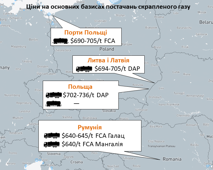 Ринок Польщі реагує більш суттєвим підвищенням. Ціни на автомобільні партії суміші на польських терміналах упродовж тижня зросли на $20-25/т, до $665-715/т на умовах FCA. З урахуванням доставлення до польсько-українського кордону це $702-736/т. На експорт газ пропонували лише дві польські компанії, але очікувано успіху не мали.
