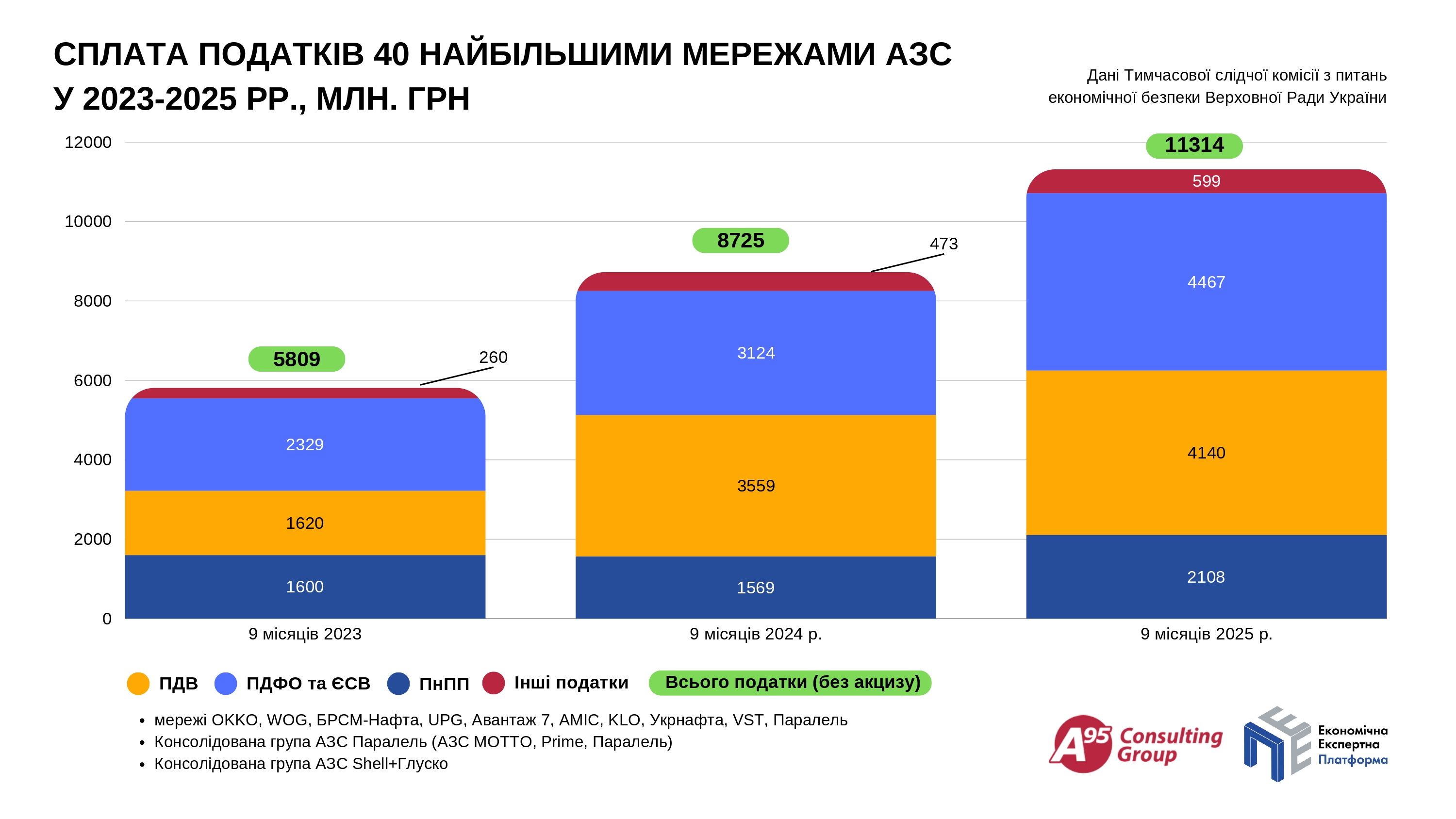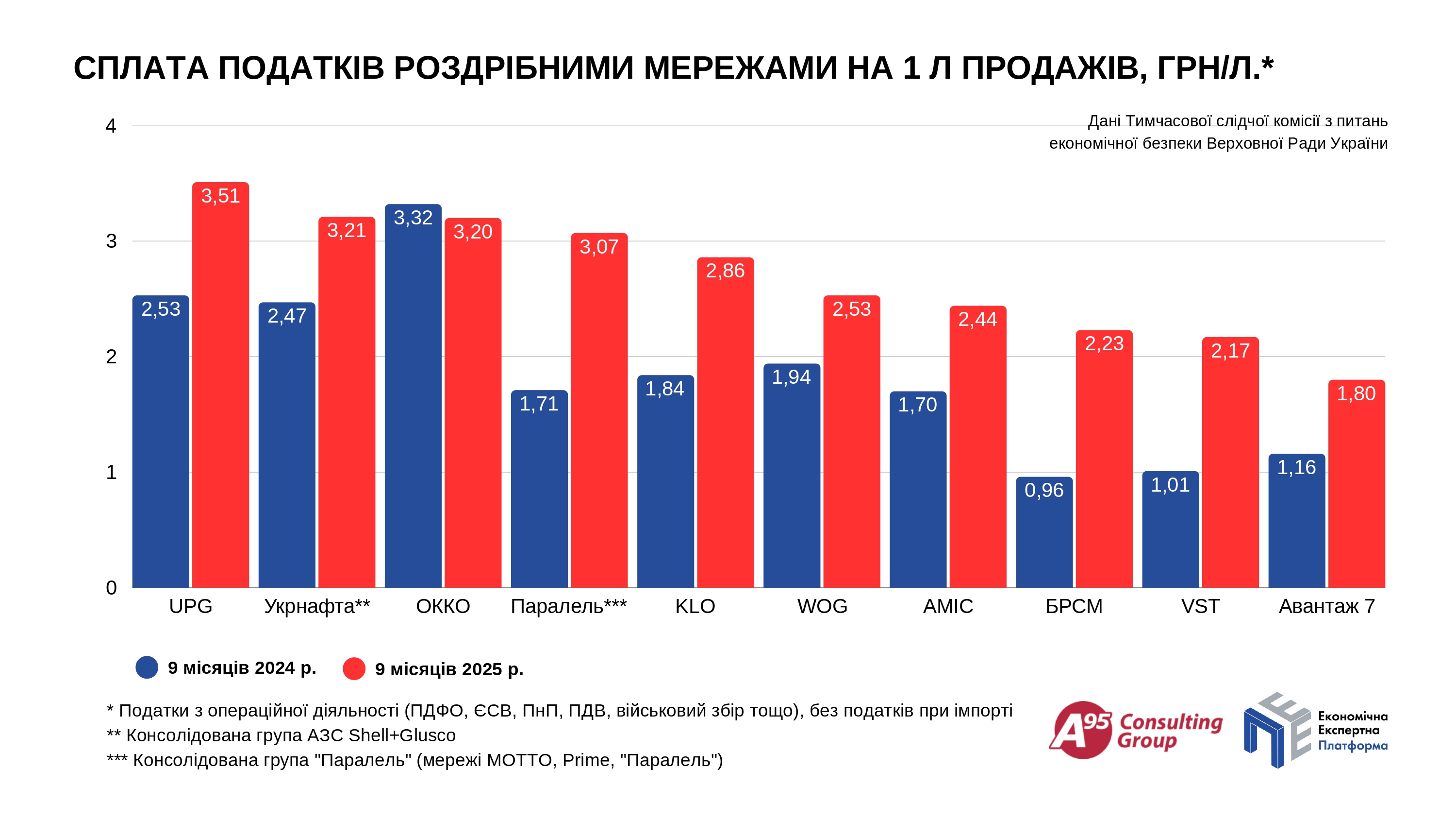 За останніми наявними даними, за три квартали 2025 р. порівняно з відповідним періодом 2023 року сплата операційних податків сорока найбільшими роздрібними мережами АЗС зросла майже удвічі — з 5,8 до 11,3 млрд грн. За рік збільшення становило 30% (2,6 млрд грн). Сплата ПДВ за два роки збільшилася на 155%. ПДФО та ЄСВ — на 92%. Податок на прибуток — на 31,7% (див. Інфографіка 1).