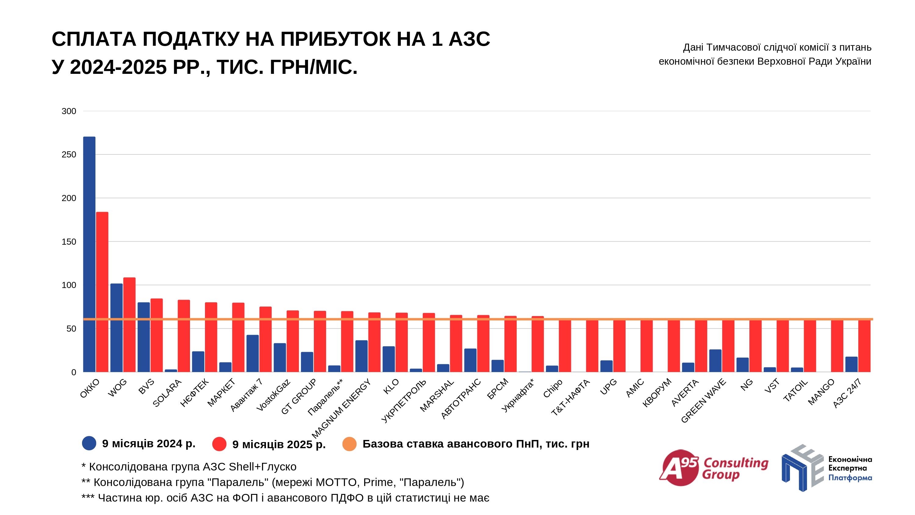 Понад 210 млн грн дала «Укрнафта», а точніше дві мережі — колишні Shell та Glusco. Перша з початку 2025 року стала власністю держкомпанії та Фонду держмайна в пропорції 51% на 49%, друга перебуває в управлінні. Найбільший внесок стався добровільно-примусово — 116 млн грн довелося сплатити як авансовий ПнП. Раніше, 2024-го, обидві мережі цей податок не платили, бо на папері були безприбуткові. Також «Укрнафта» відчутно підвищила оклади персоналу — з 23 до майже 29 тис. грн з відповідним ефектом у розмірі 70 млн грн для держбюджету.
